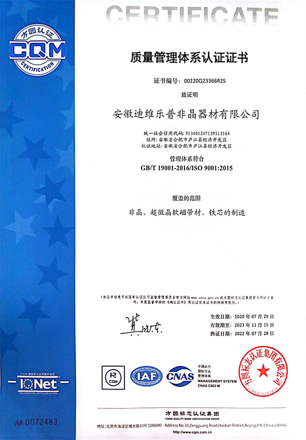 • 安徽迪維樂普非晶器材有限公司企業質量標準